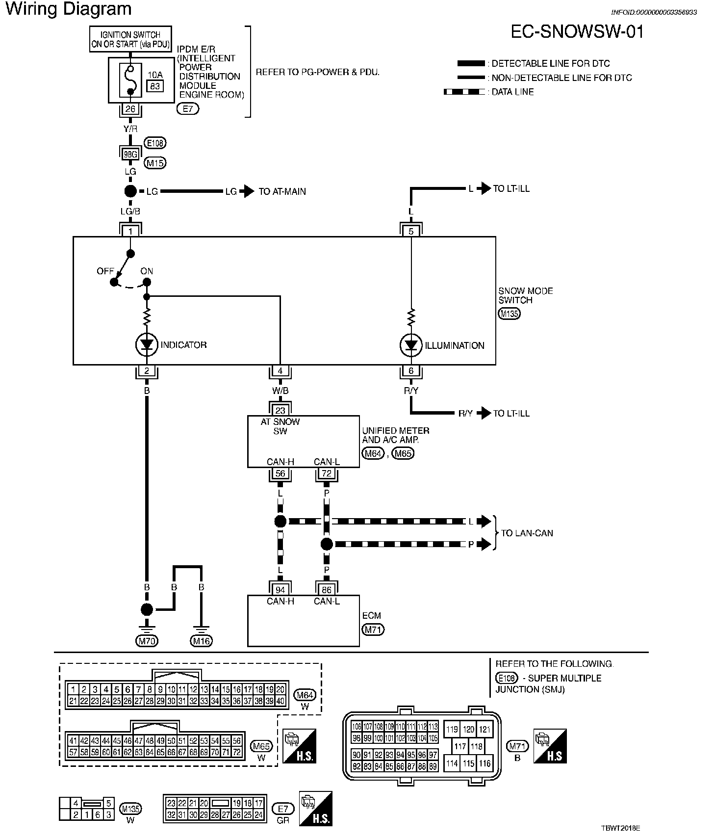 The snow mode switch signal is sent to the "unified meter and A/C amp." from the snow mode switch. The "unified meter and A/C amp." then sends the signal to the ECM by CAN communication line.