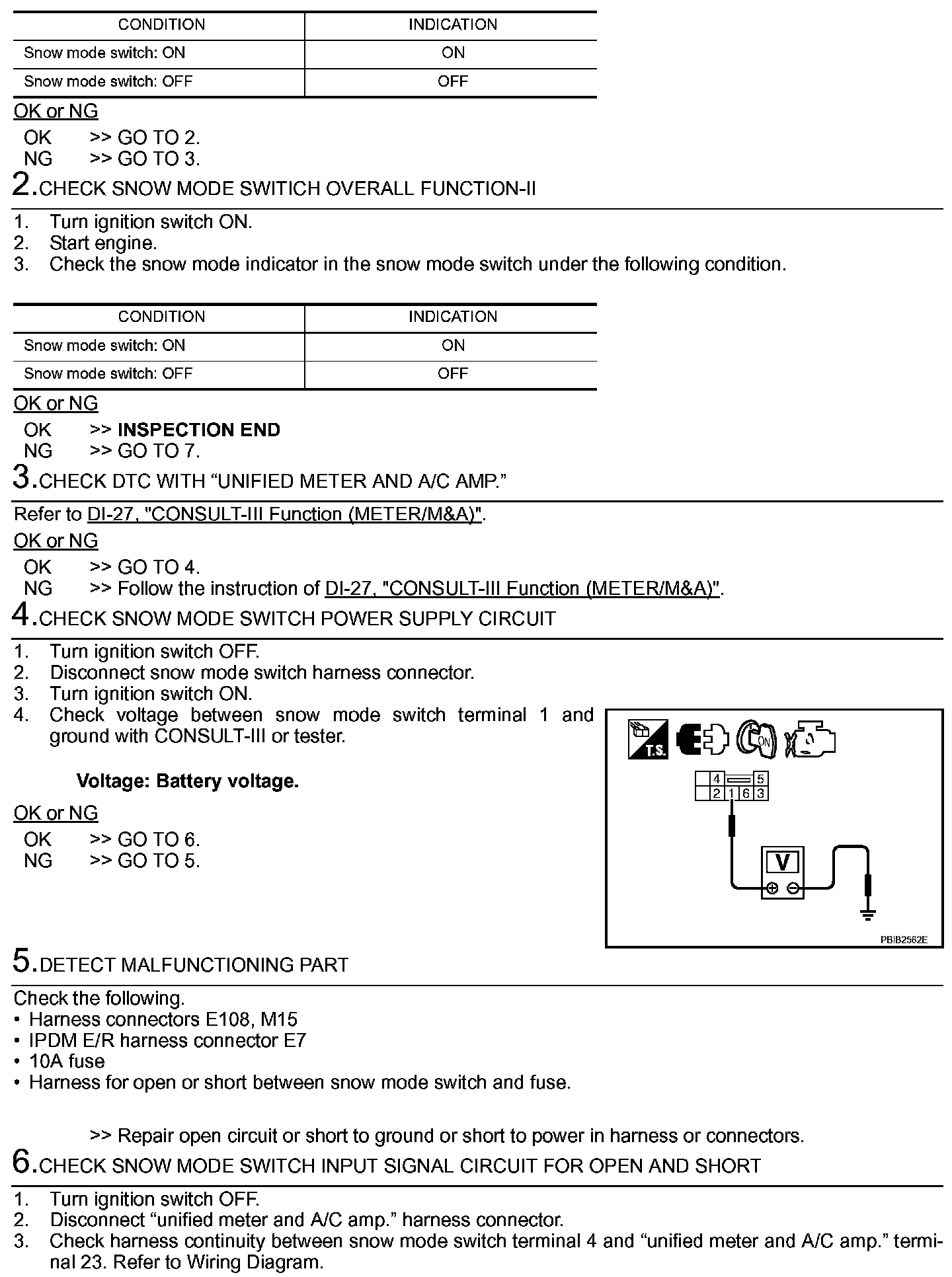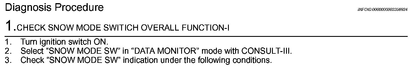 3. Check continuity between snow mode switch terminals 2 and 4 under the following conditions.