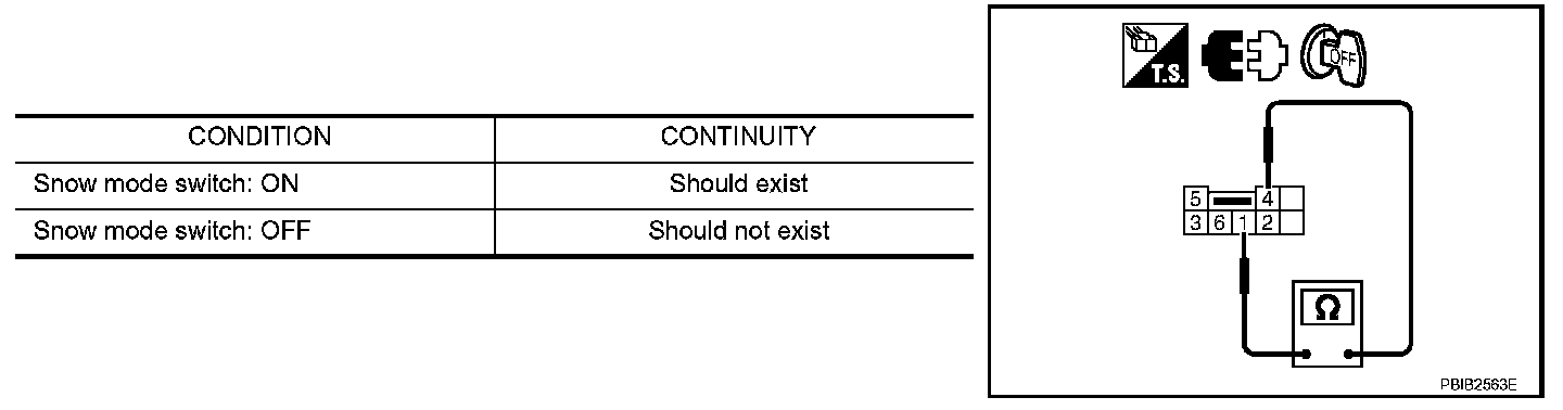 1. Check continuity between snow mode switch terminals 1 and 4 under the following conditions.