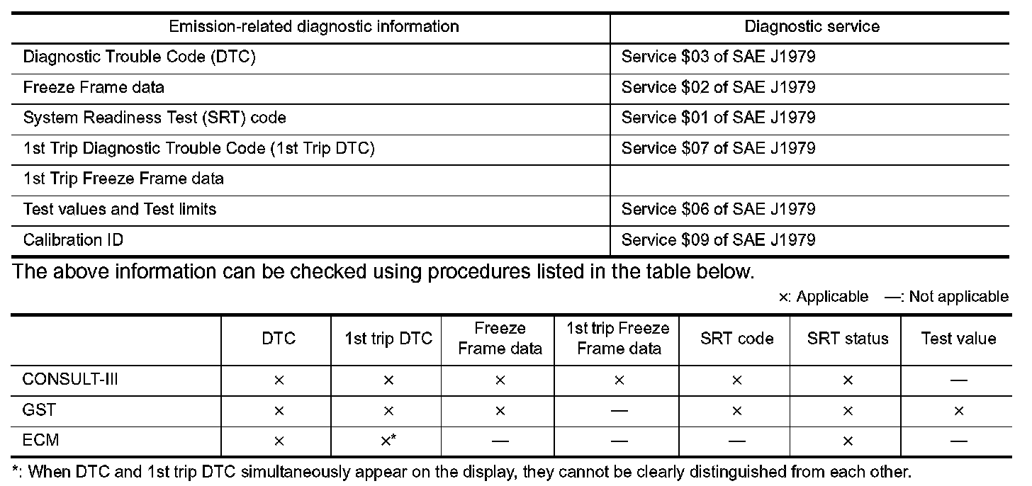 The malfunction indicator lamp (MIL) on the instrument panel lights up when the same malfunction is detected in two consecutive trips (Two trip detection logic), or when the ECM enters fail-safe mode. (Refer to EC-707, "Fail-Safe Chart".) Fail-Safe Chart