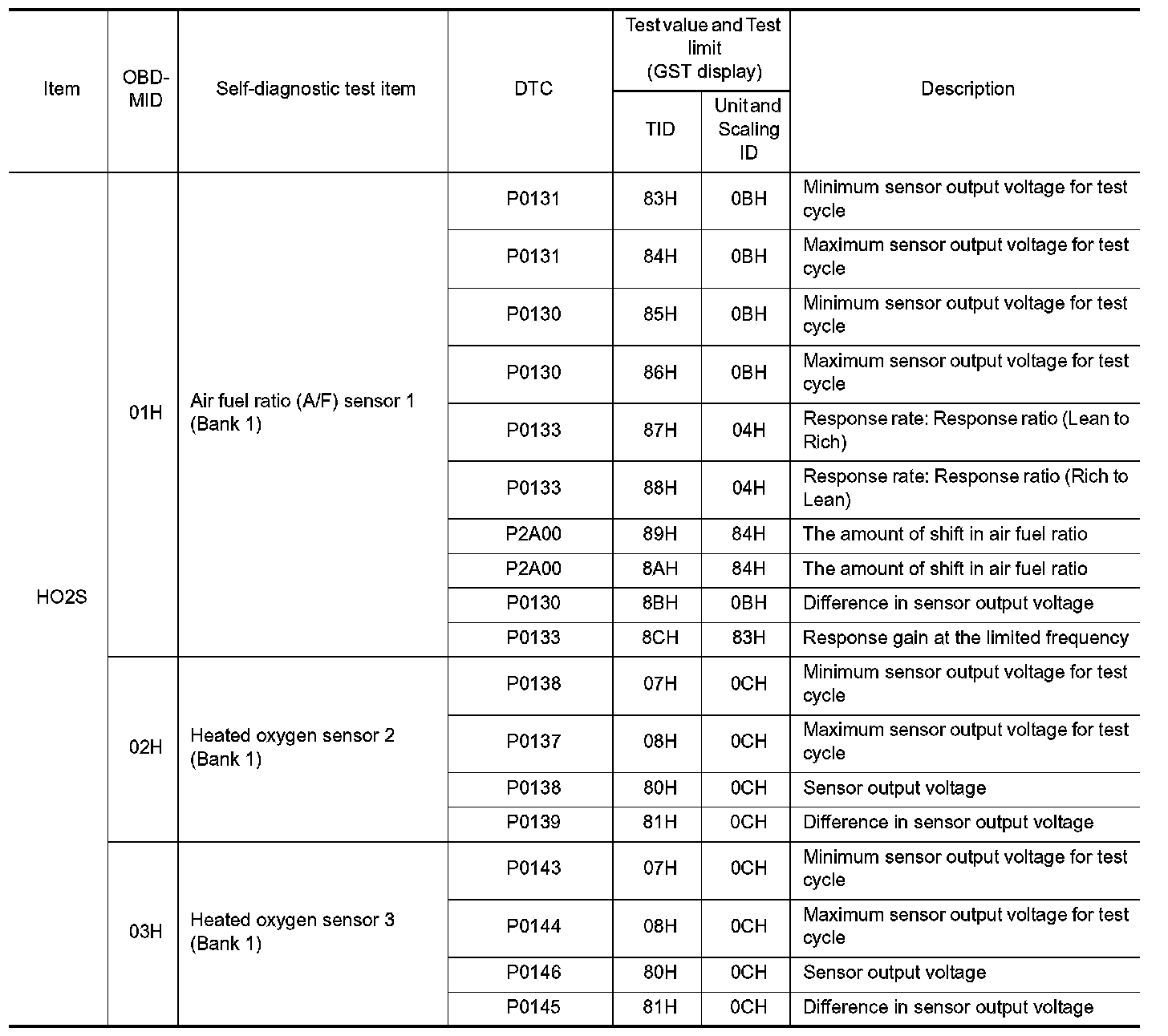 These data (test value and test limit) are specified by On Board Monitor ID(OBDMID), Test ID (TID), Unit and Scaling ID and can be displayed on the GST screen.
