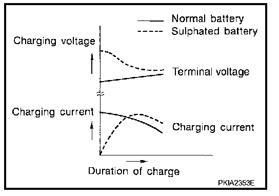 To determine if a battery has been "sulphated", note its voltage and current when charging it. As shown in the figure, less current and higher voltage are observed in the initial stage of charging sulphated batteries.
