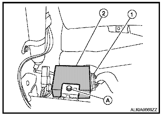 2. Disconnect the wire harness (1), remove the bolt (A) and the Intelligent key unit (2).