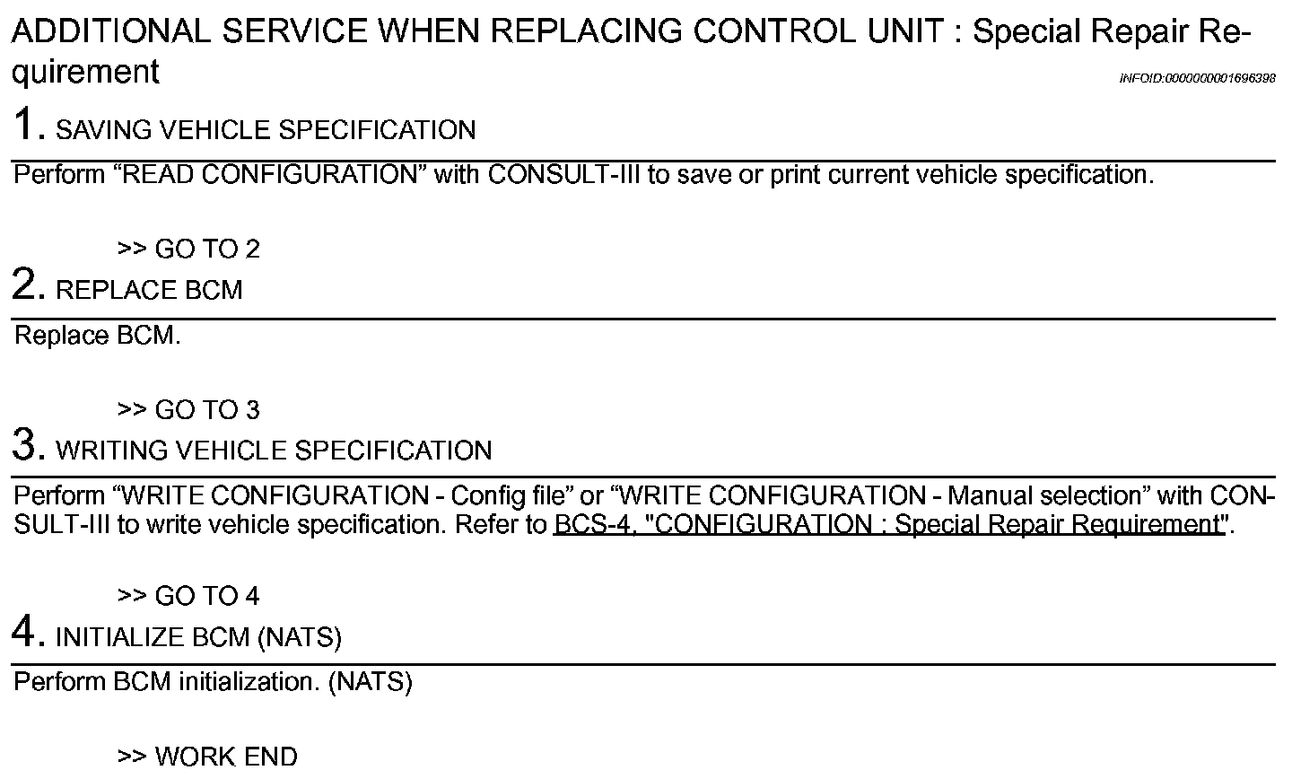 ADDITIONAL SERVICE WHEN REPLACING CONTROL UNIT: DescriptionWhen replacing BCM, save or print current vehicle specification with CONSULT-III configuration before replacement.