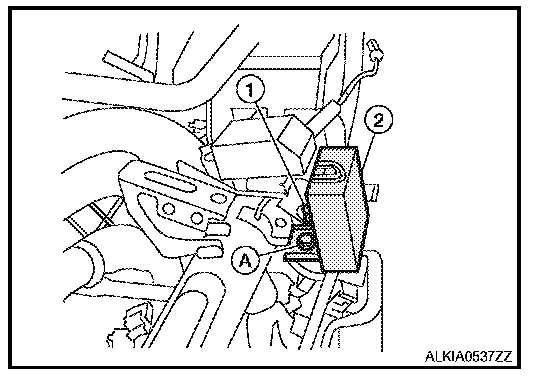 2. Disconnect the wire harness (1), remove the bolt (A) and the RKE receiver (2).