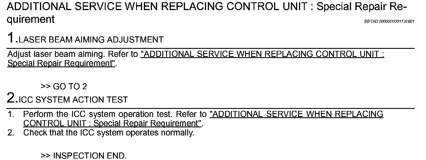 Always perform the laser beam aiming adjustment after replacing the ICC unit. In addition, test the ICC system operations to see if it functions normally.