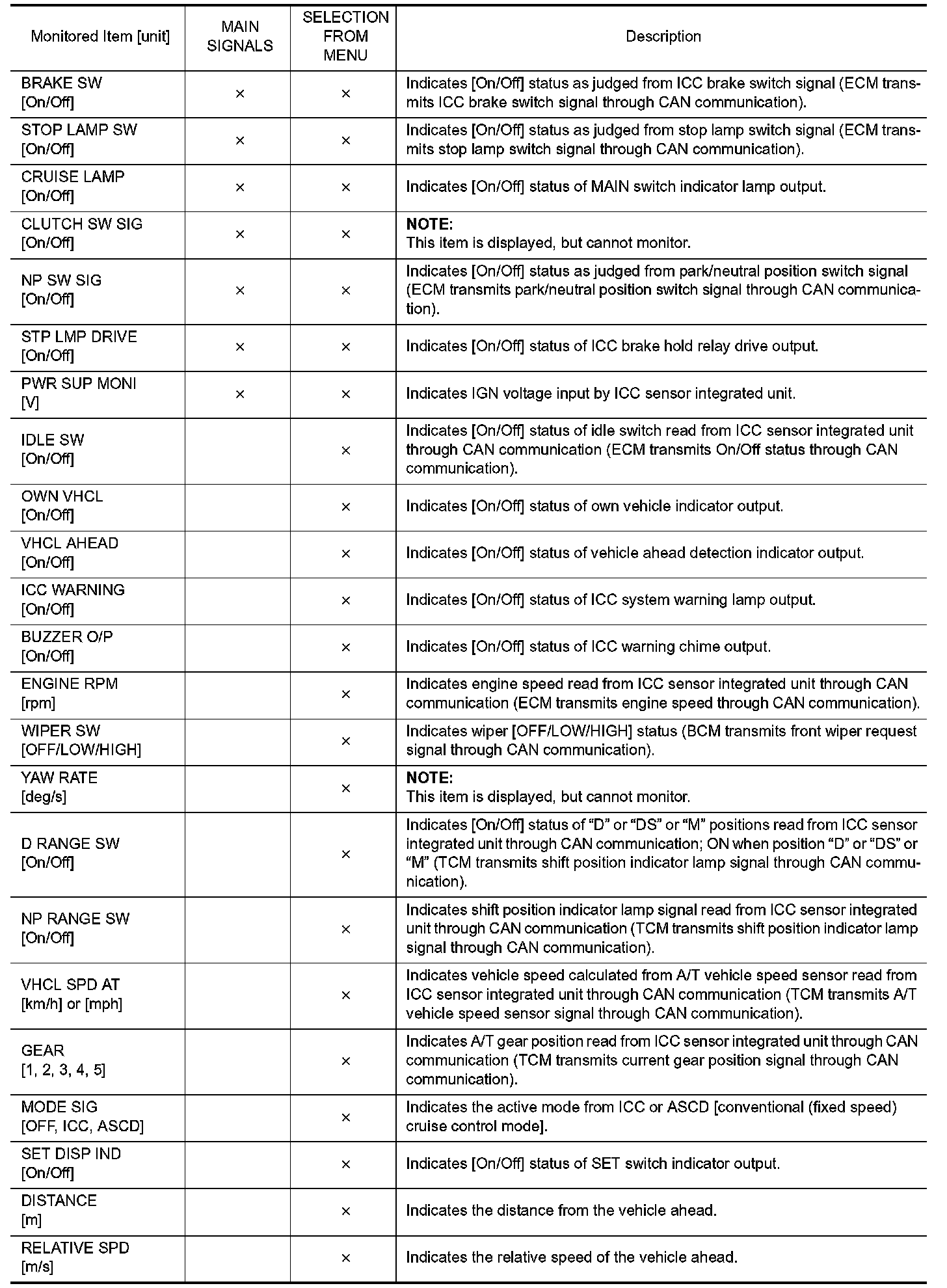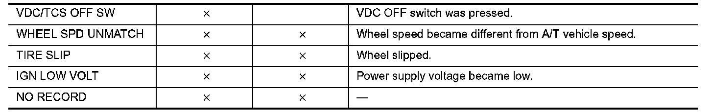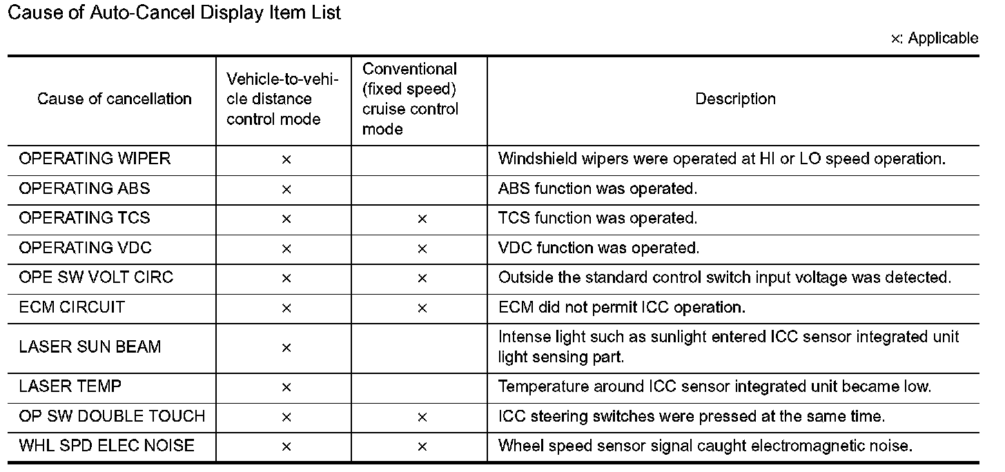 - "CAUSE OF AUTO-CANCEL" displays times of ignition switch ON/OFF up to 254 maximum. 254 is kept though the number exceeds 254. The number returns to 0 when detecting the same cancellation causes.