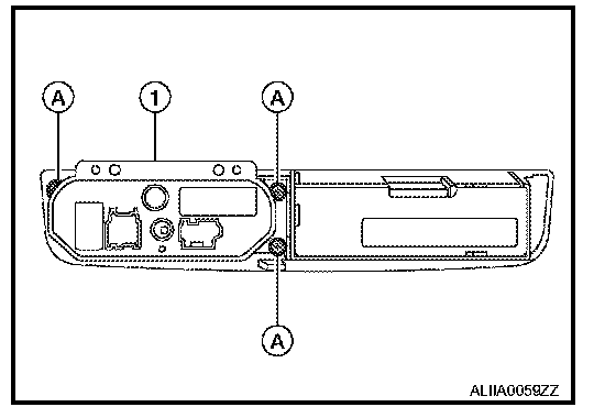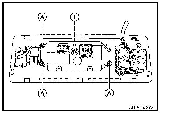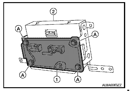 2. Remove the four screws (A) and remove the A/C auto amp. (1) from the back of the display unit (2).