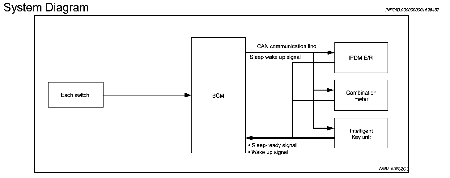 - IPDM E/R changes from the low power consumption mode to the normal mode when it receives a sleep wake-up signal (wake up) from BCM or any of the following conditions is fulfilled. In addition, it transmits a sleep-ready signal (not-ready) to BCM via CAN communication to report the CAN communication start.