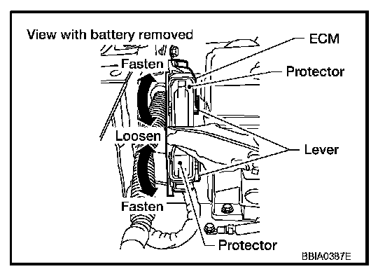 - When connecting ECM harness connector, fasten it securely with a lever as far as it will go as shown in the figure.