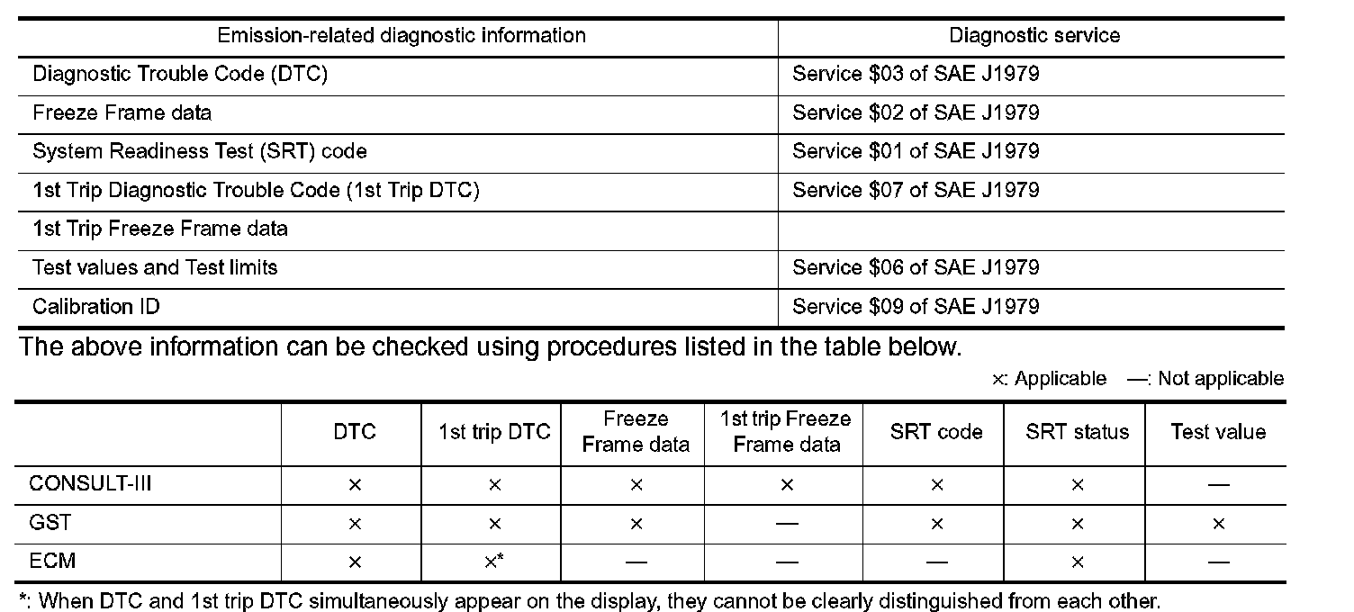 The malfunction indicator lamp (MIL) on the instrument panel lights up when the same malfunction is detected in two consecutive trips (Two trip detection logic), or when the ECM enters fail-safe mode. (Refer to EC-451, "Fail-Safe Chart".) Fail-Safe Chart