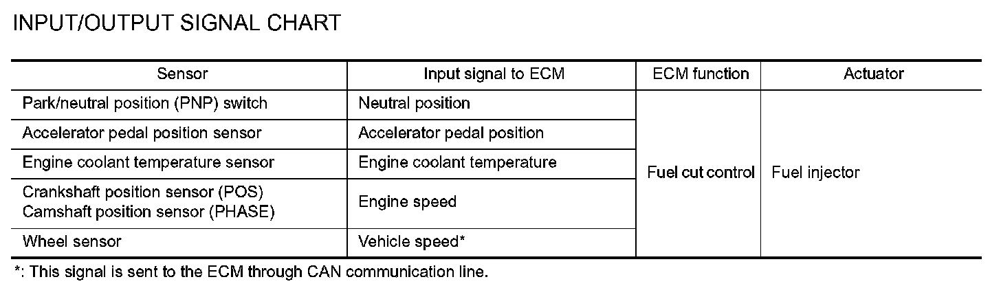 If the engine speed is above 1,800 rpm under no load (for example, the shift position is neutral and engine speed over is 1,800 rpm) fuel will be cut off after some time. The exact time when the fuel is cut off varies based on engine speed.