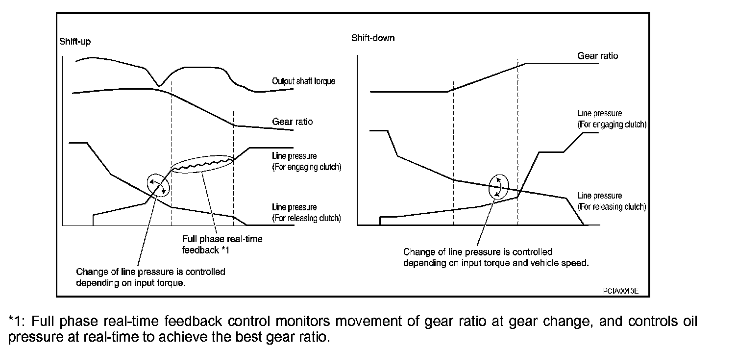 Shift ControlThe clutch pressure control solenoid is controlled by the signals from the switches and sensors. Thus, the clutch pressure is adjusted to be appropriate to the engine load state and vehicle driving state. It becomes possible to finely control the clutch hydraulic pressure with high precision and a smoother shift change characteristic is attained.