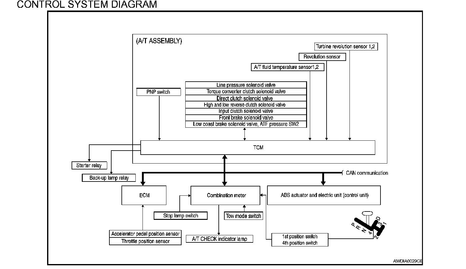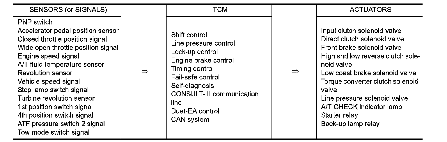 The automatic transmission senses vehicle operating conditions through various sensors or signals. It always controls the optimum shift position and reduces shifting and lock-up shocks.