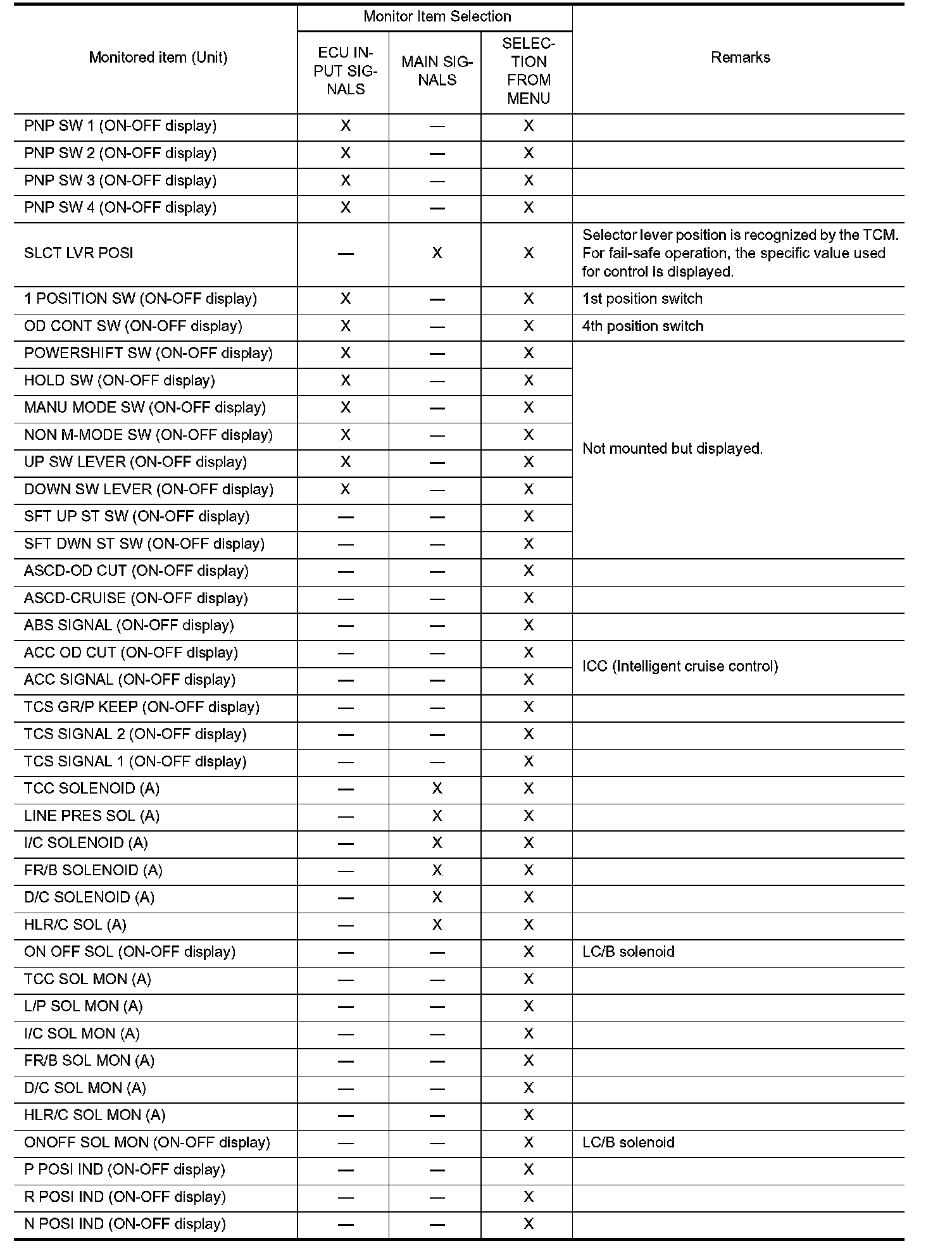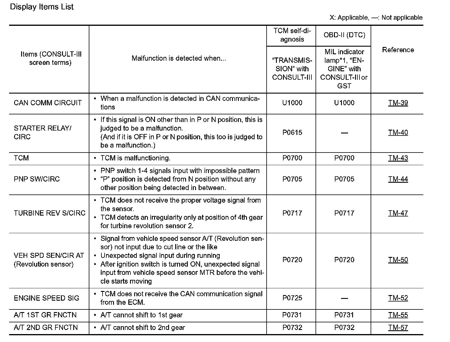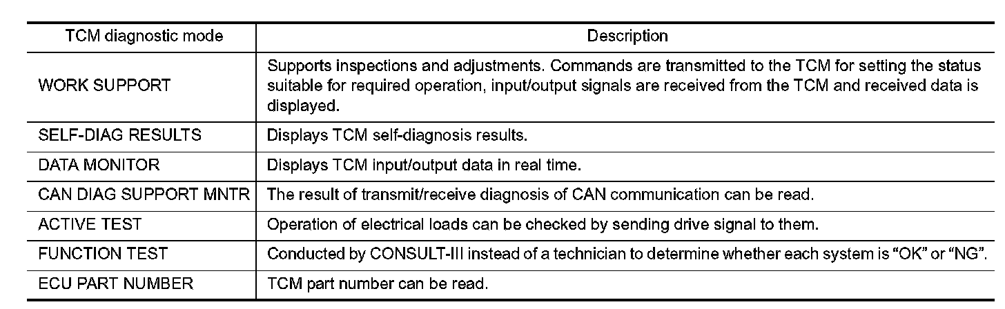 CONSULT-III Function (TRANSMISSION)CONSULT-III can display each diagnostic item using the diagnostic test modes shown following.