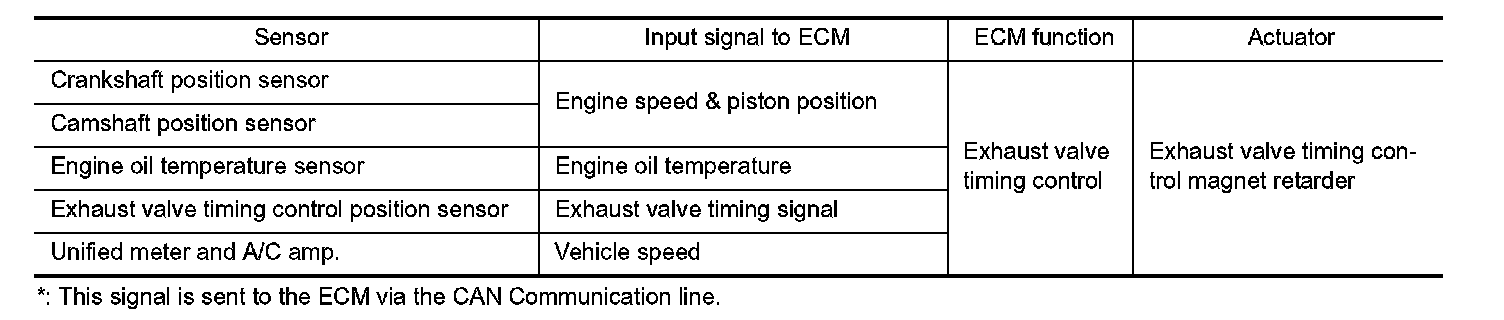 The ECM receives signals such as crankshaft position, camshaft position, engine speed, and engine oil temperature. Then, the ECM sends ON/OFF pulse duty signals to the exhaust valve timing control magnet retarder depending on driving status. This makes it possible to control the shut/open timing of the exhaust valve to increase engine torque and output in a range of high engine speed.