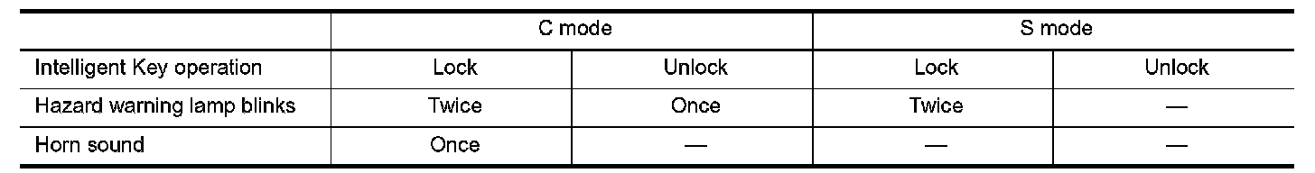 When LOCK and UNLOCK signals are sent from the Intelligent Key for more than 2 seconds at the same time, the hazard and horn reminder mode is changed and hazard warning lamp flashes and horn sounds as per the following: