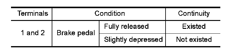 2. Check the continuity between ASCD brake switch terminals under the following conditions.