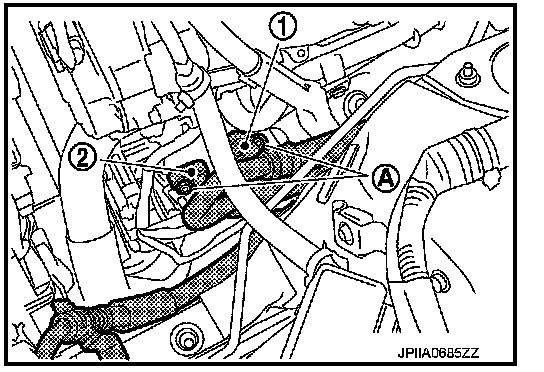 5. Remove mounting nuts (A) from low-pressure flexible hose (1) and high-pressure flexible hose (2).