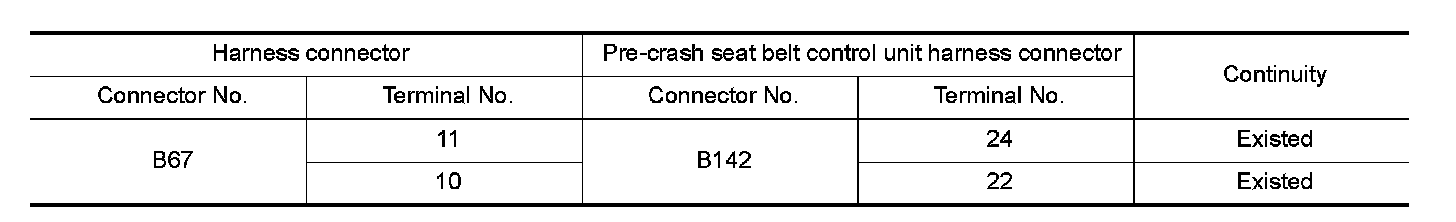 2. Check the continuity between the harness connector and the pre-crash seat belt control unit harness connector.