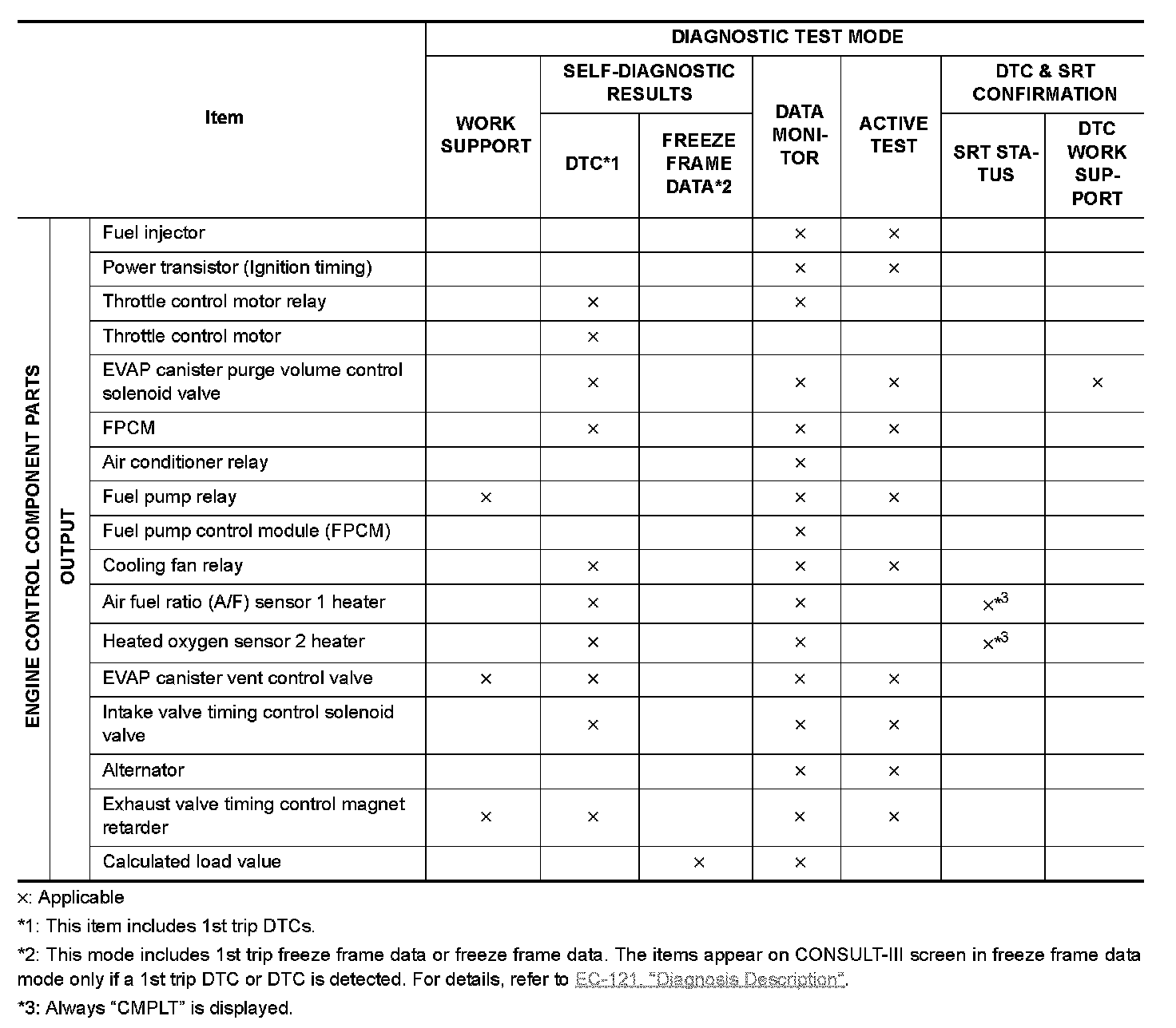 Regarding items of DTC and 1st trip DTC, refer to Testing and Inspection.