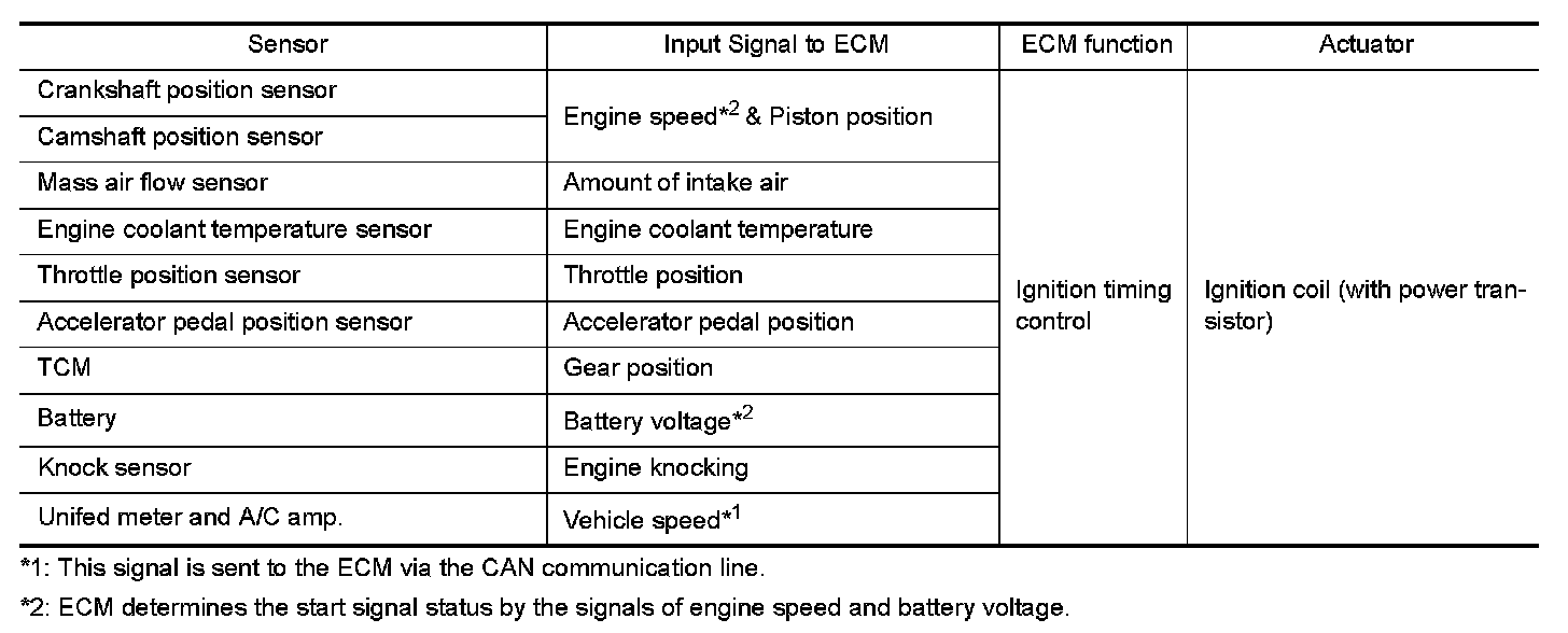The ECM receives information such as the injection pulse width and camshaft position sensor signal. Computing this information, ignition signals are transmitted to the power transistor.