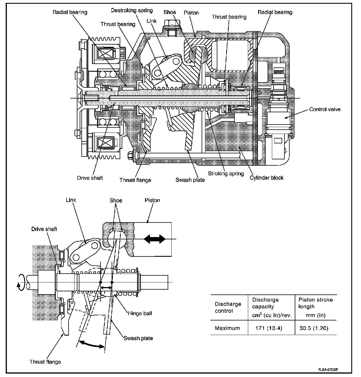 The tilt of the swash plate allows the piston's stroke to change so that refrigerant discharge continuously change from approx. 0 to 171 cm3 (0 to 10.4 cu in).