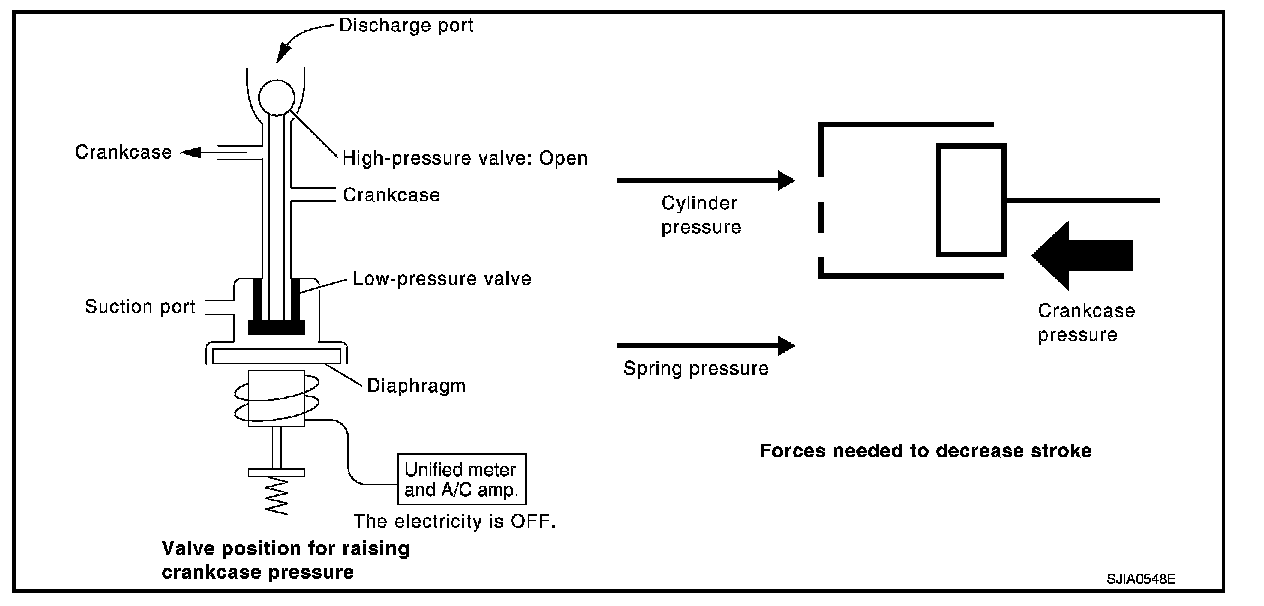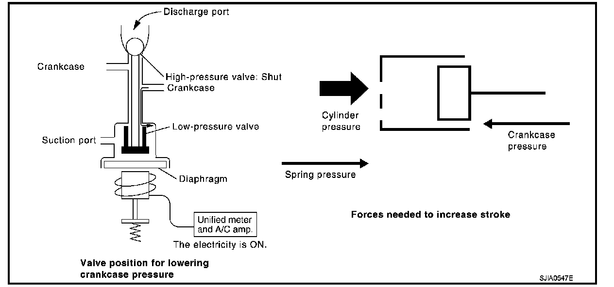 A/C amp. At this time, cylinder moves full stroke due to pressure balance between inside crankcase (Pc) and suction line (Ps).