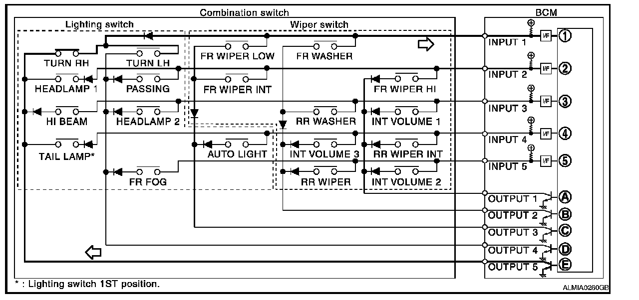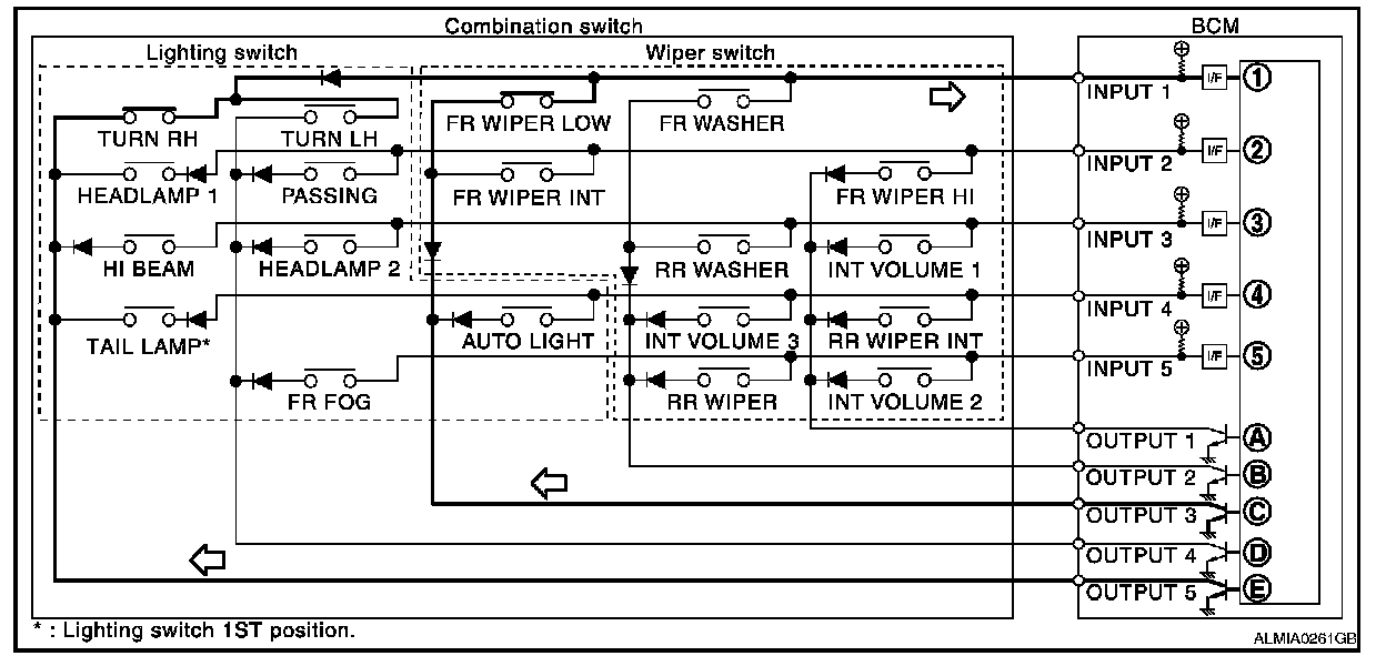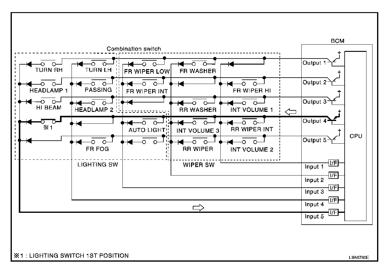 - BCM detects the combination switch status signal "1CE" when the signals of OUTPUT 3 and OUTPUT 5 are input to INPUT 1.