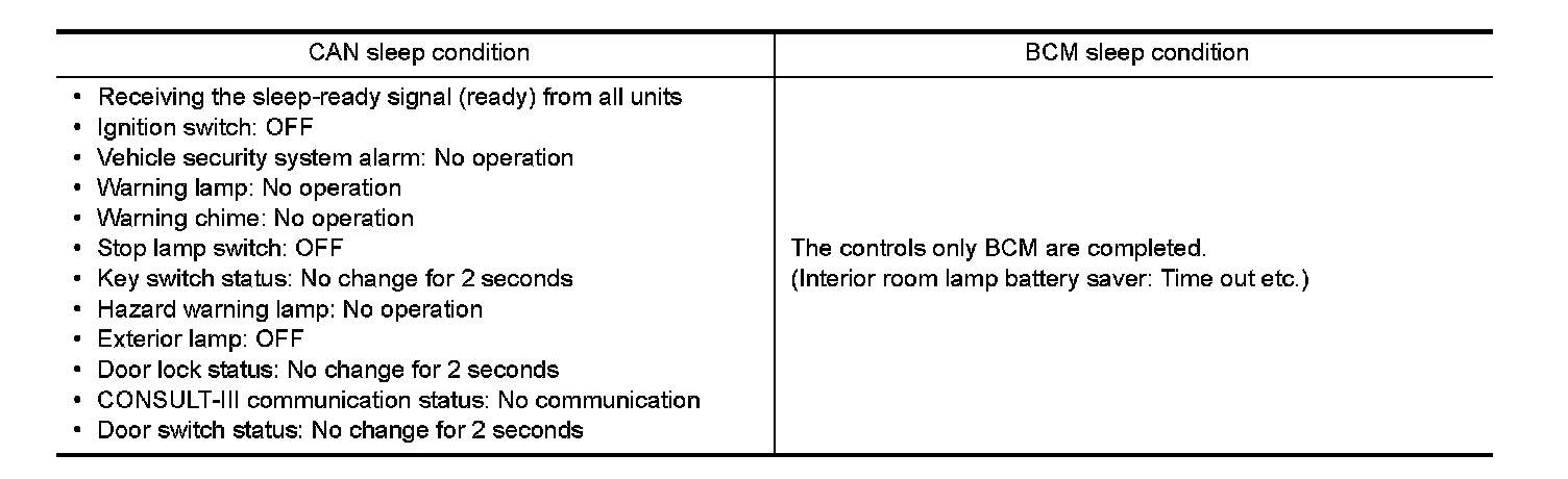 - BCM transmits the sleep wake up signal (sleep) to each unit when all of the CAN sleep conditions are fulfilled.