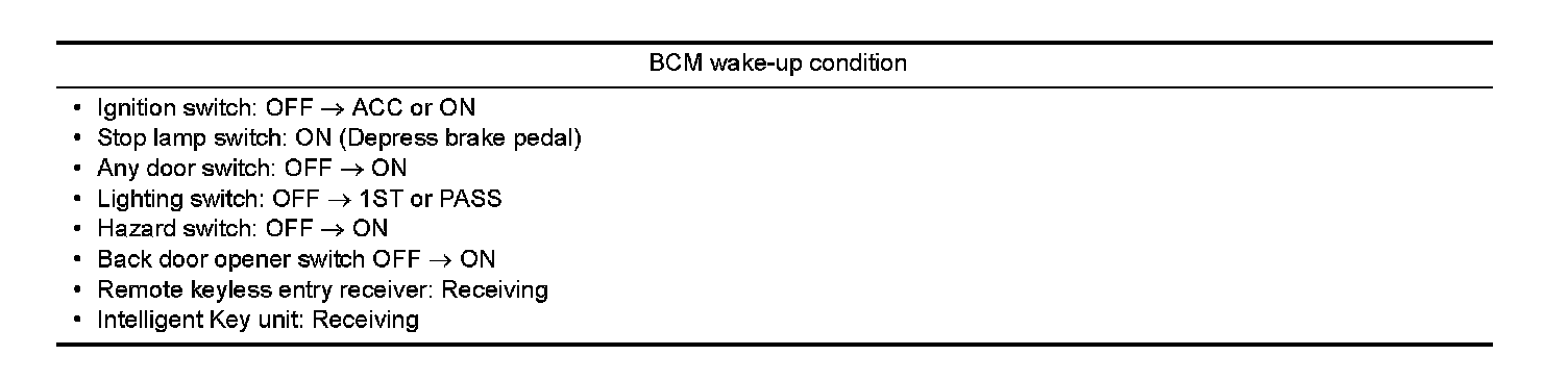 - BCM transmits sleep wake up signal (wake up) to each unit when any condition listed below is established, and then goes into normal mode from low power consumption mode.