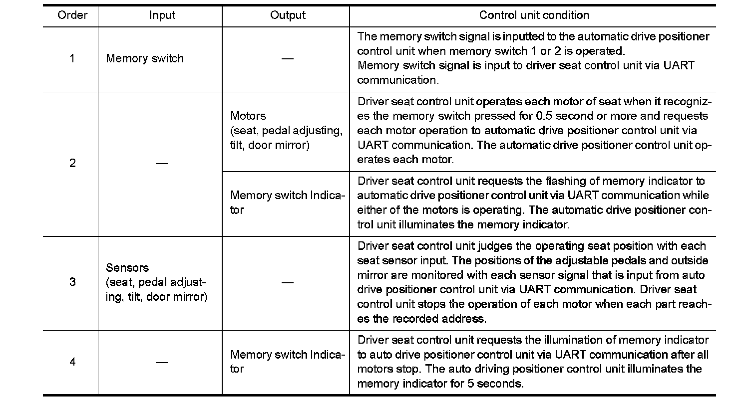 The driver seat control unit can store the optimum driving positions (seat, pedal assembly, steering wheel and door mirror position) for 2 people. If the front seat position is changed, one-touch (pressing desired memory switch for more than 0.5 second) operation allows changing to the other driving position.