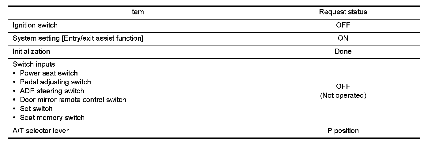 Satisfy all of the following items. The exit assist function is not performed if these items are not satisfied.