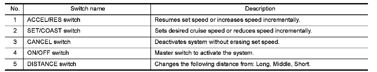 The on board self-diagnosis function of the ICC system can be started with the RESUME/ACCELERATE switch and SET/COAST switch. Refer to Diagnosis Description.