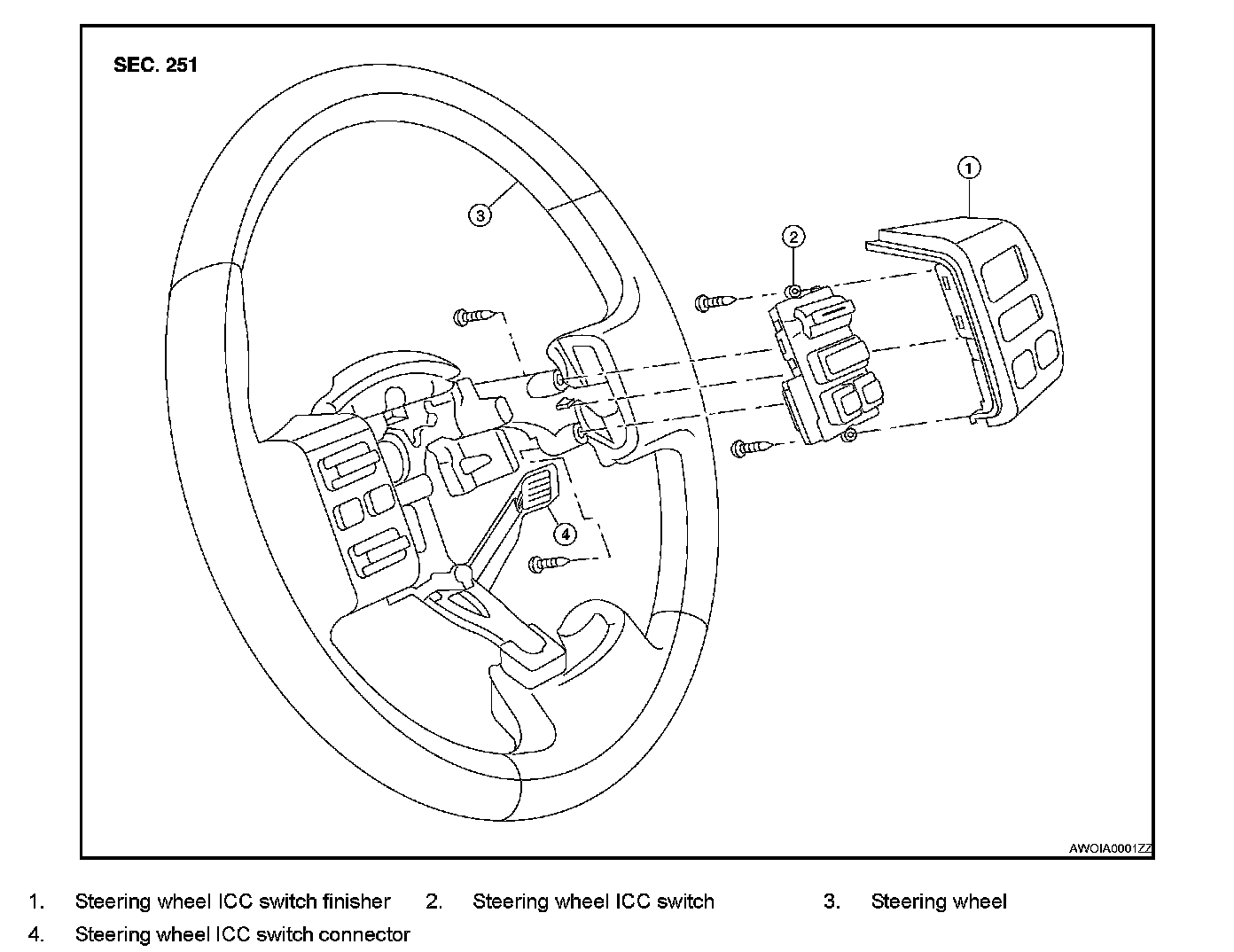 4. Remove the steering wheel ICC switch finisher screws and remove the steering wheel ICC switch finisher.