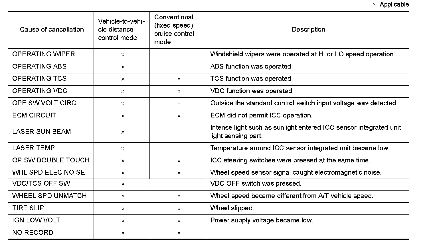 - "CAUSE OF AUTO-CANCEL" displays times of ignition switch ON/OFF up to 254 maximum. 254 is kept though the number exceeds 254. The number returns to 0 when detecting the same cancellation causes.