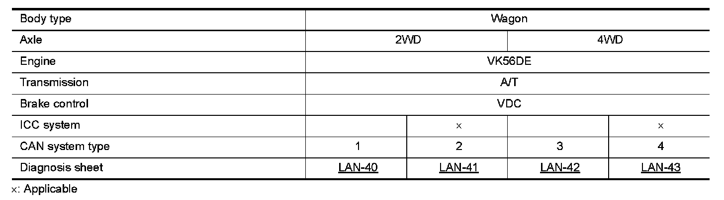 Determine CAN system type from the following specification chart. Then choose the correct diagnosis sheet.