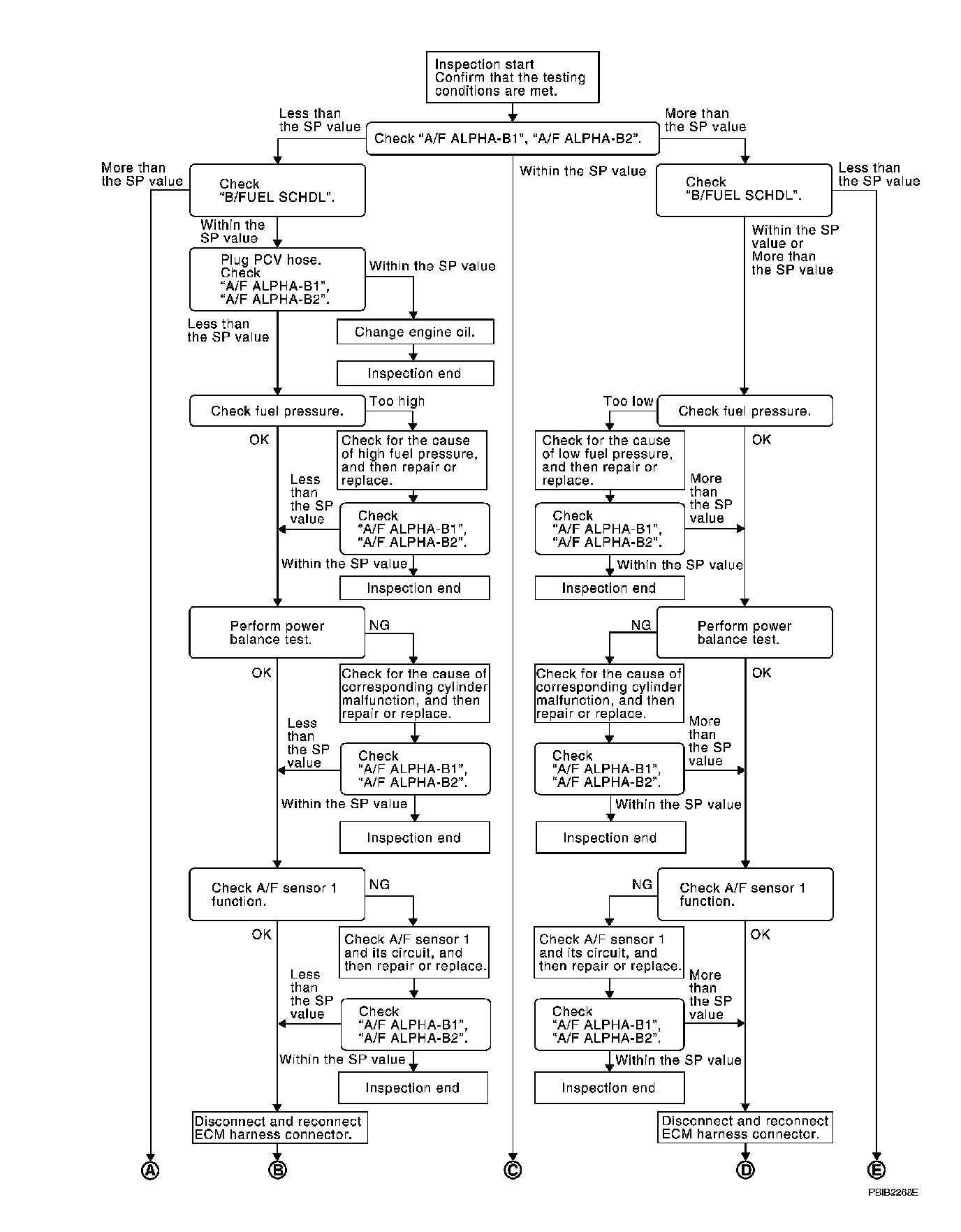 Check "A/F ALPHA-B1", "A/F ALPHA-B2" for approximately 1 minute because they may fluctuate. It is NG if the indication is out of the SP value even a little.