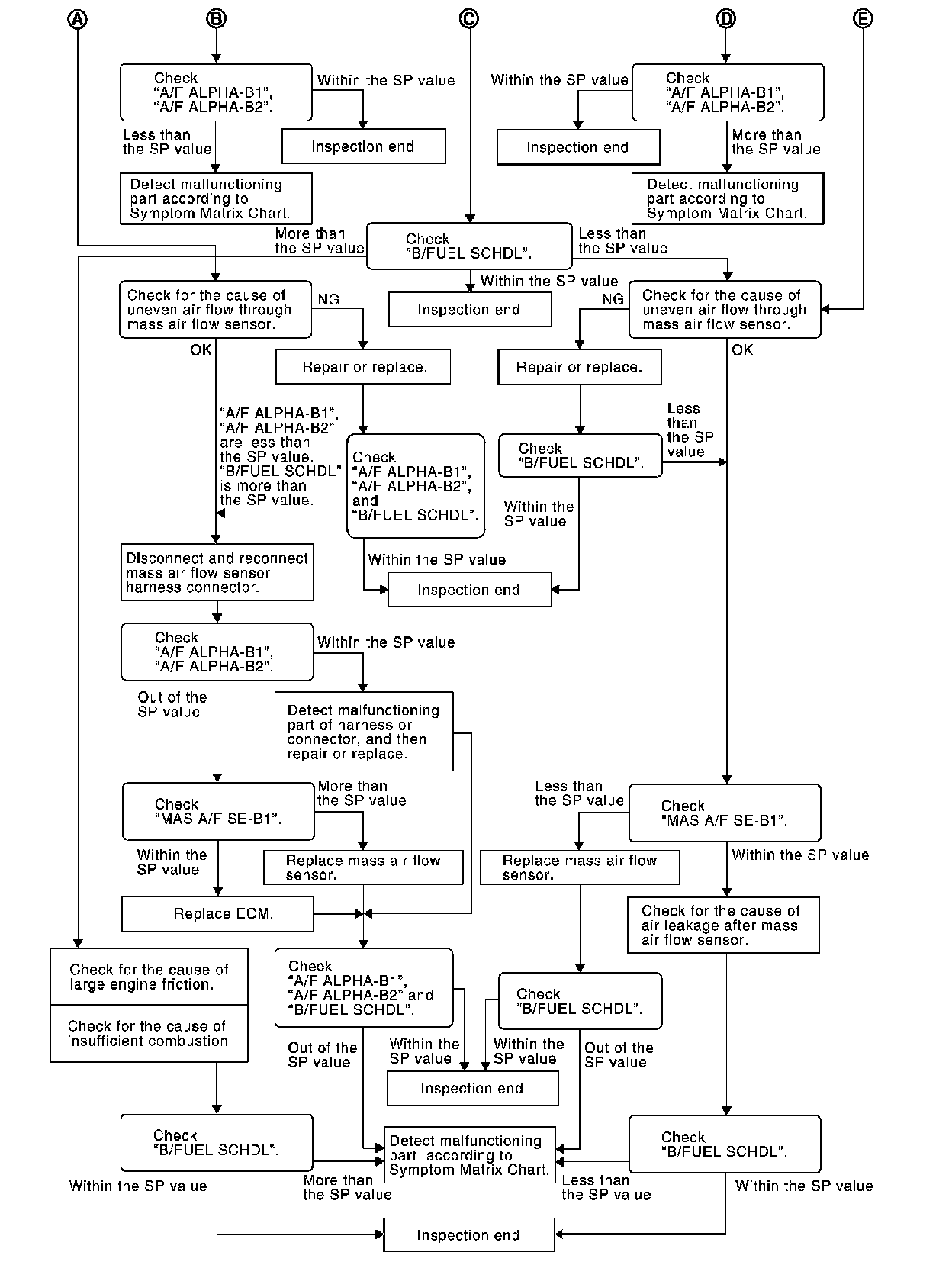 Select "A/F ALPHA-B1", "A/F ALPHA-B2", and "B/FUEL SCHDL" in "SPEC" of "DATA MONITOR" mode, and make sure that the each indication is within the SP value.