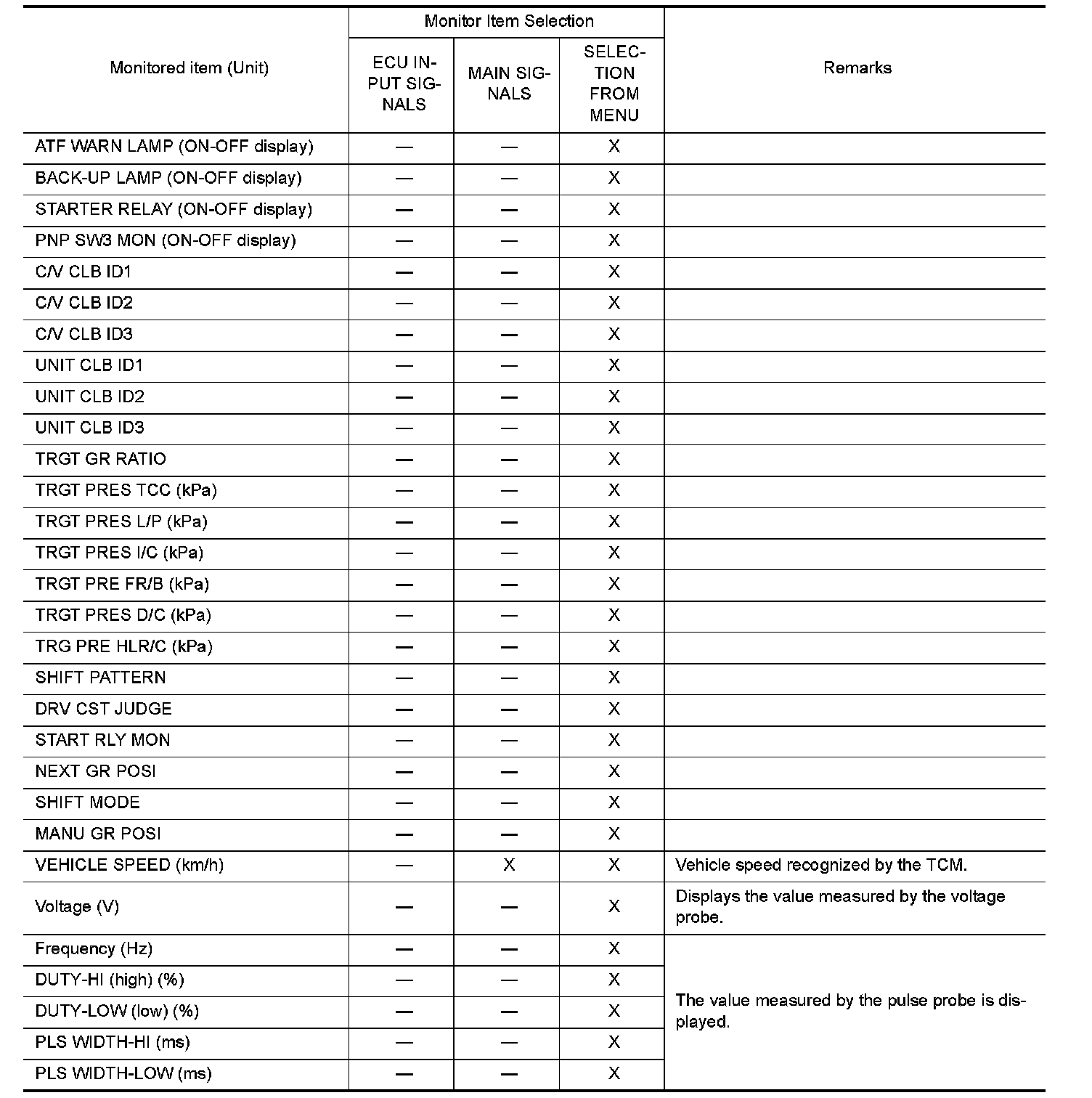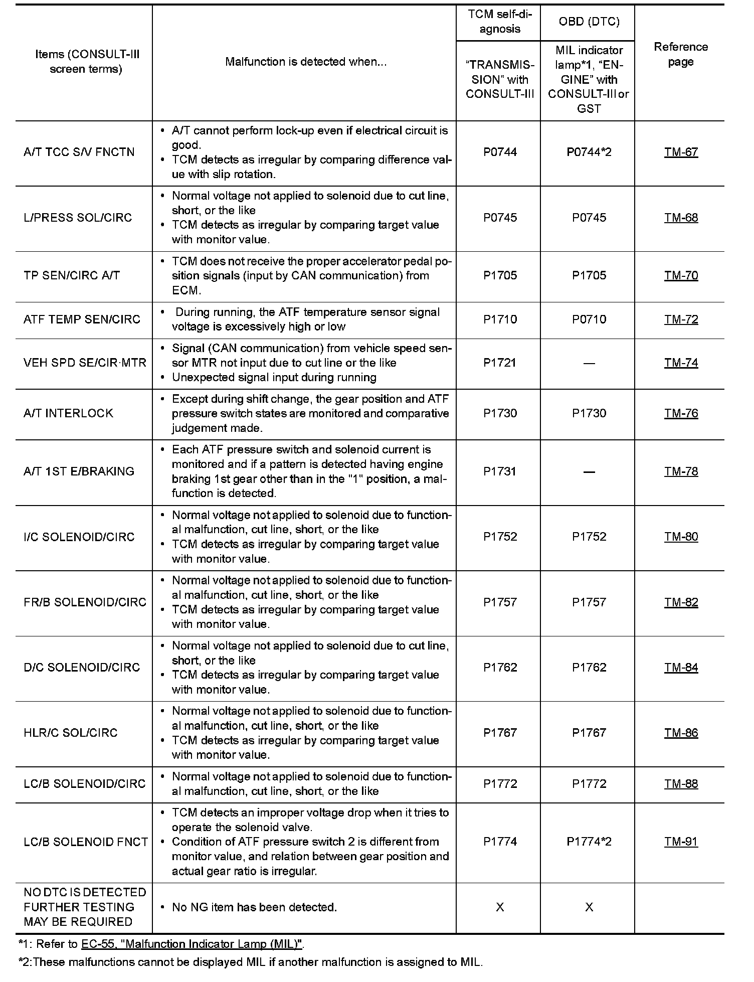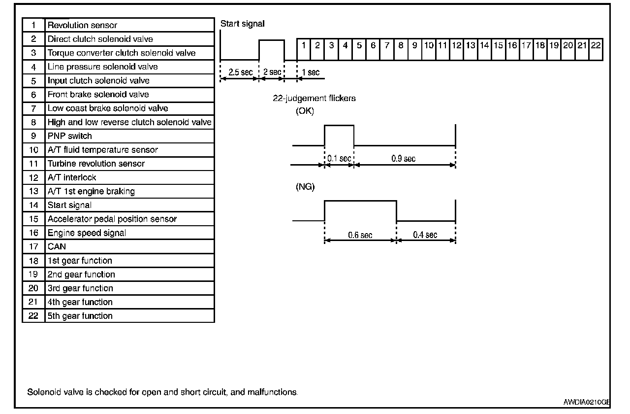When the ignition switch is switched "ON", the A/T CHECK indicator lamp lights up for 2 seconds. As a method for locating the suspect circuit, when the self-diagnostics start signal is input, the memory for the malfunction location is output and the A/T CHECK indicator lamp flashes to display the corresponding DTC.