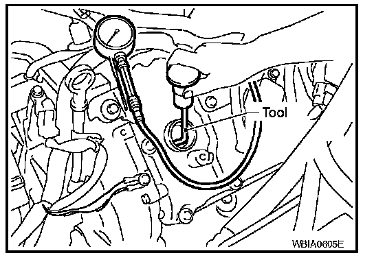 6. With the accelerator pedal fully depressed, turn the ignition switch to "START" for cranking. When the gauge pointer stabilizes, read the compression pressure and engine rpm. Perform these steps to check each cylinder.