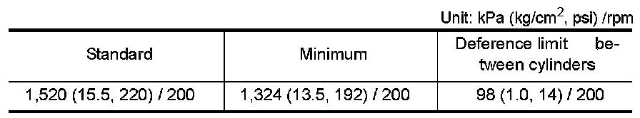 - If the compression pressure is below the minimum value, check the valve clearances and parts associated with the combustion chamber (valve, valve seat, piston, piston ring, cylinder bore, cylinder head, cylinder head gasket). After checking, measure the compression pressure again.