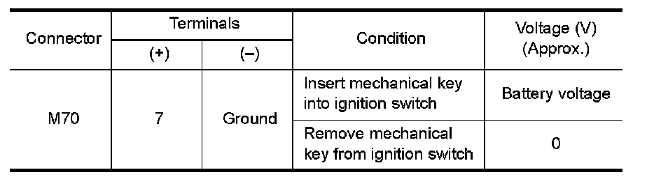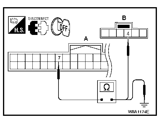 1. Check continuity between Intelligent Key unit harness connector (A) M70 terminal 7 and key switch and ignition knob switch harness connector (B) M12 terminal 4.