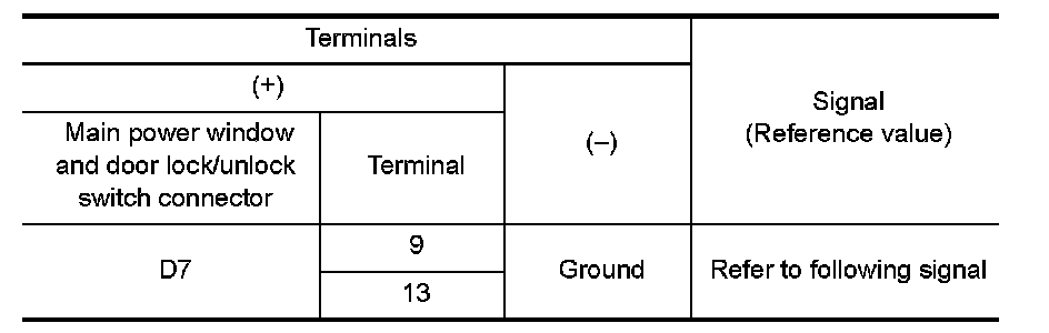 2. Check signal between main power window and door lock/unlock switch connector and ground with oscilloscope.