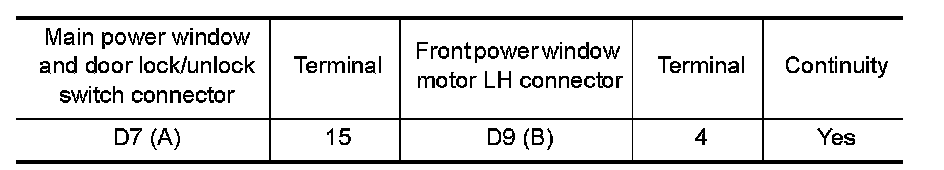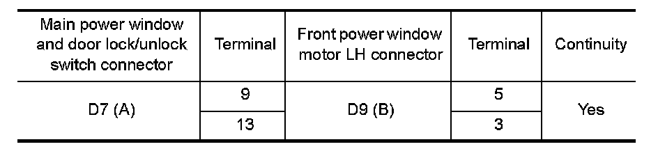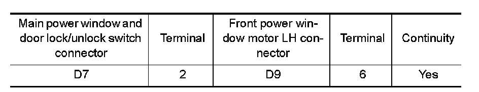 3. Check continuity between main power window and door lock/unlock switch connector and front power window motor LH connector.
