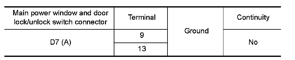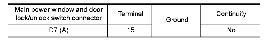 3. Check continuity between main power window and door lock/unlock switch connector and ground.