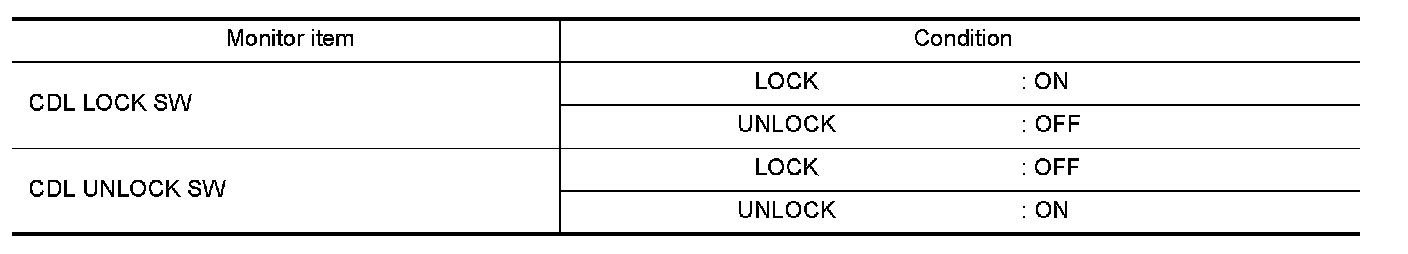 Check ("CDL LOCK SW ", "CDL UNLOCK SW") in "DATA MONITOR" mode for "POWER DOOR LOCK SYSTEM" with CONSULT-III. Refer to Door Lock.