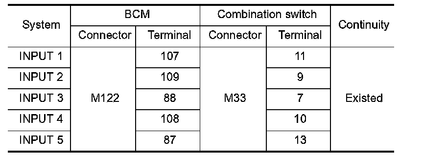 3. Check continuity between BCM harness connector and combination switch harness connector.