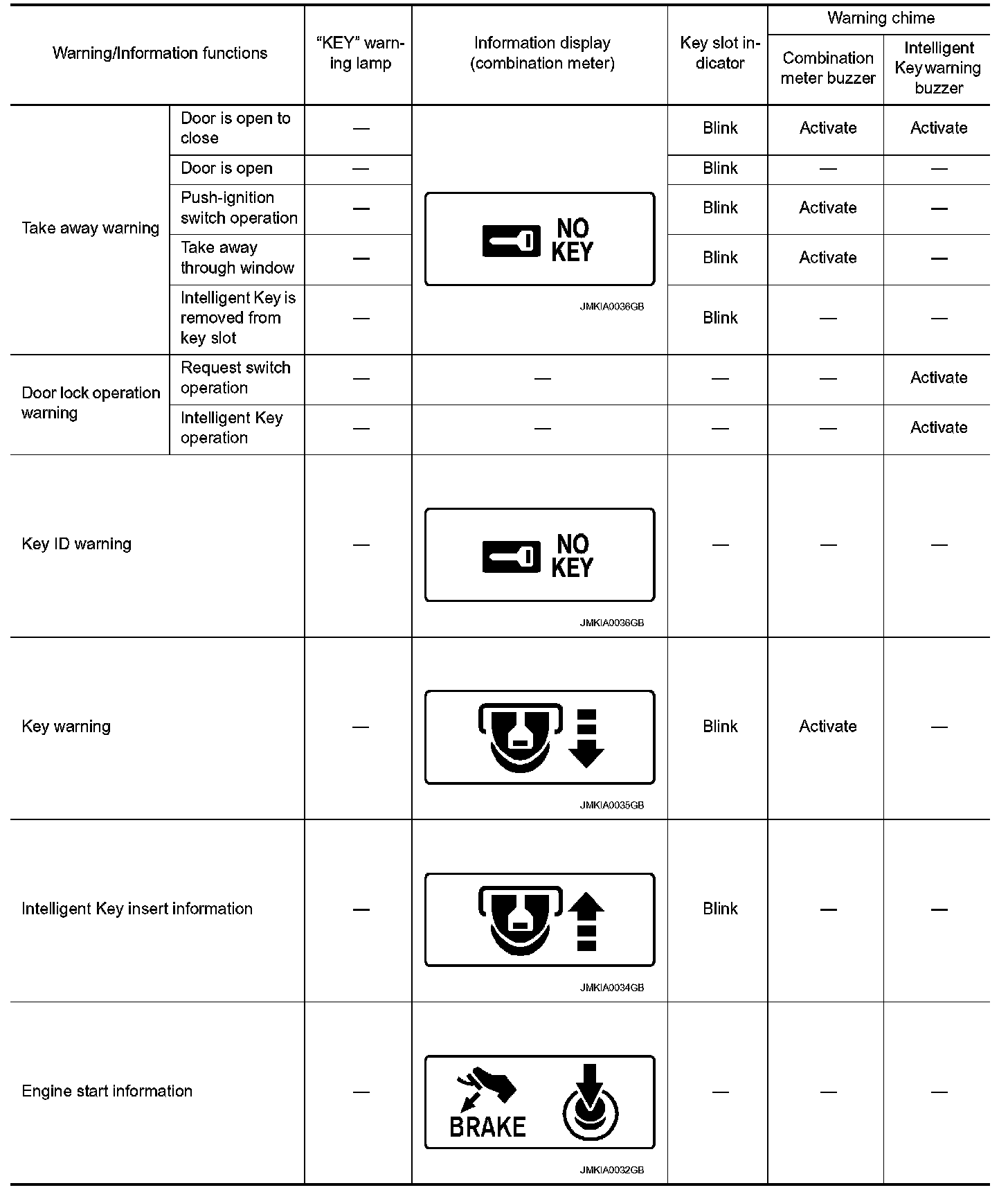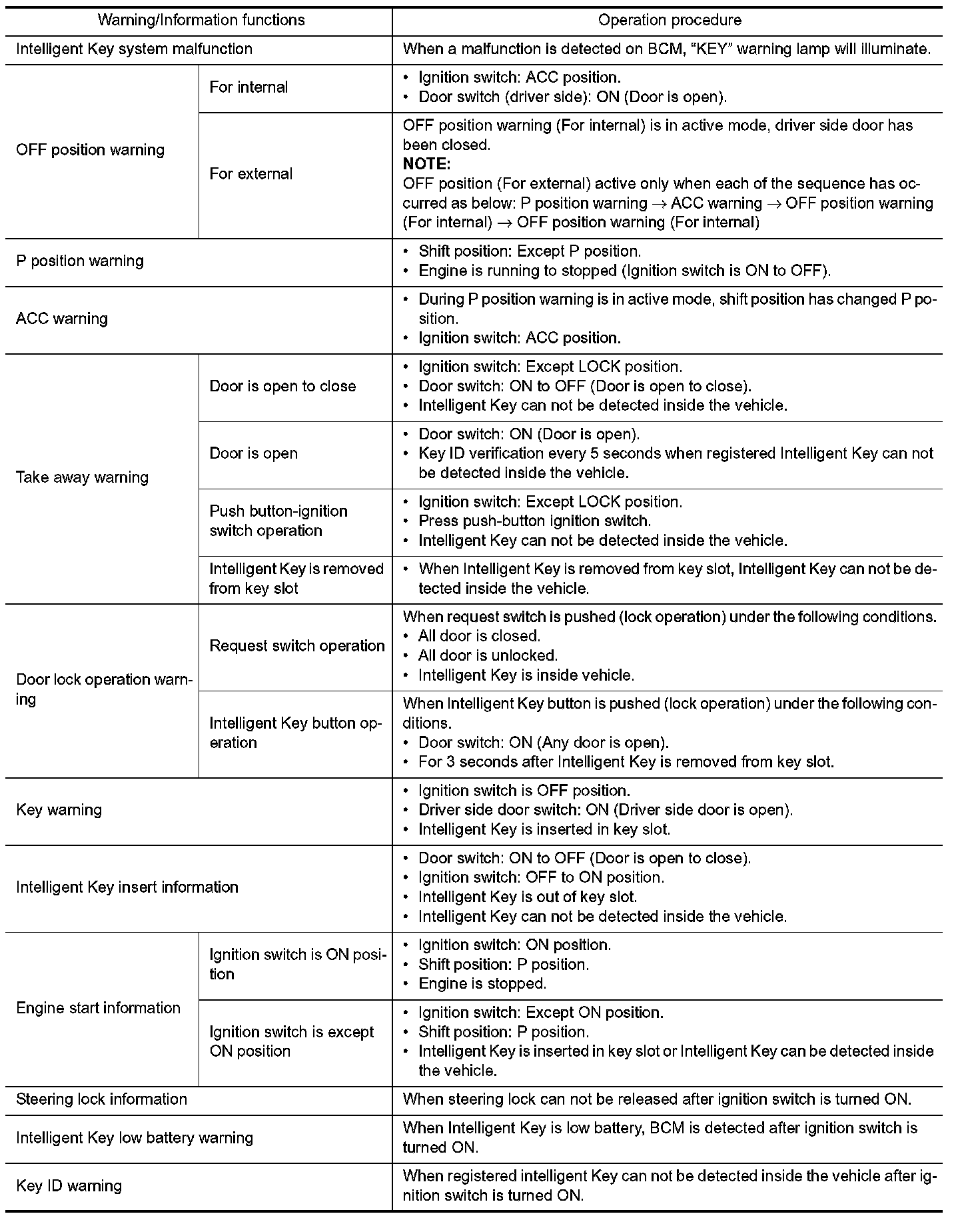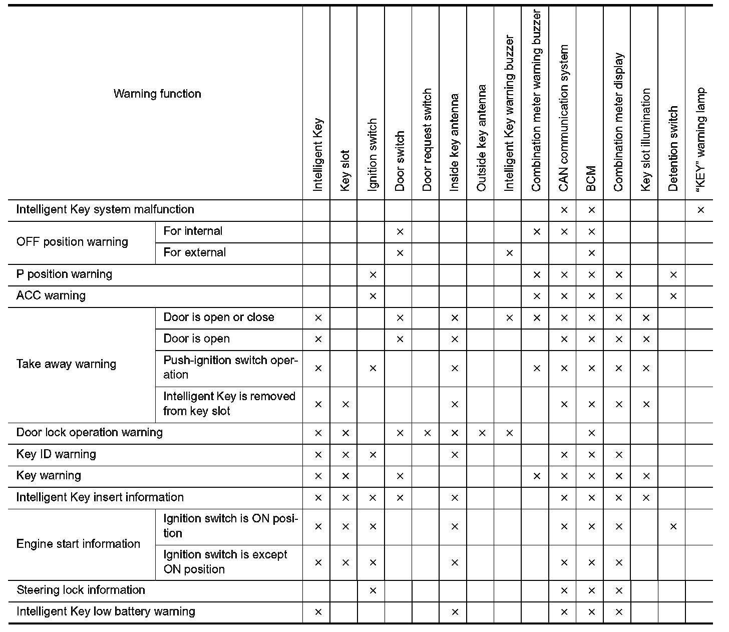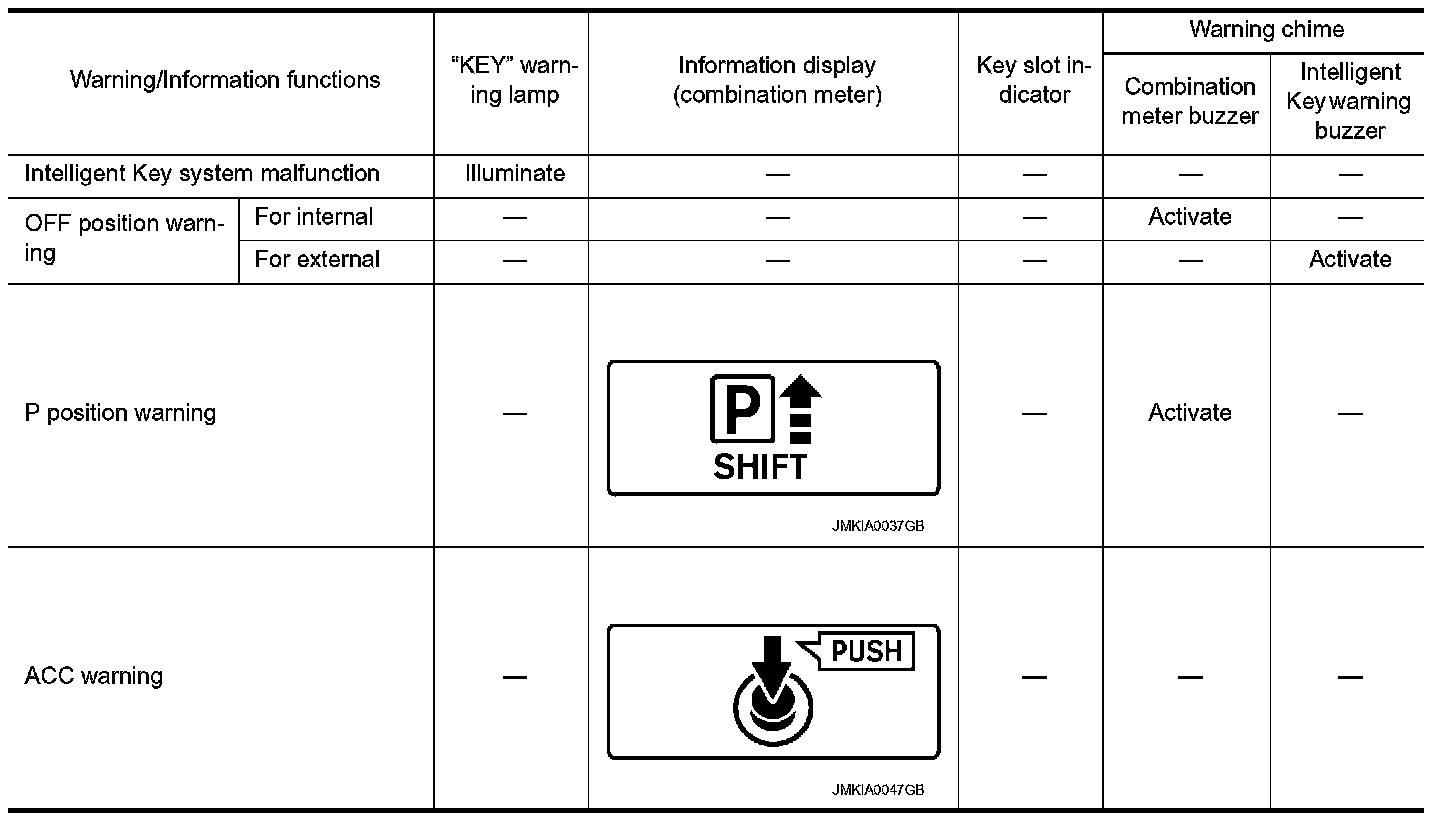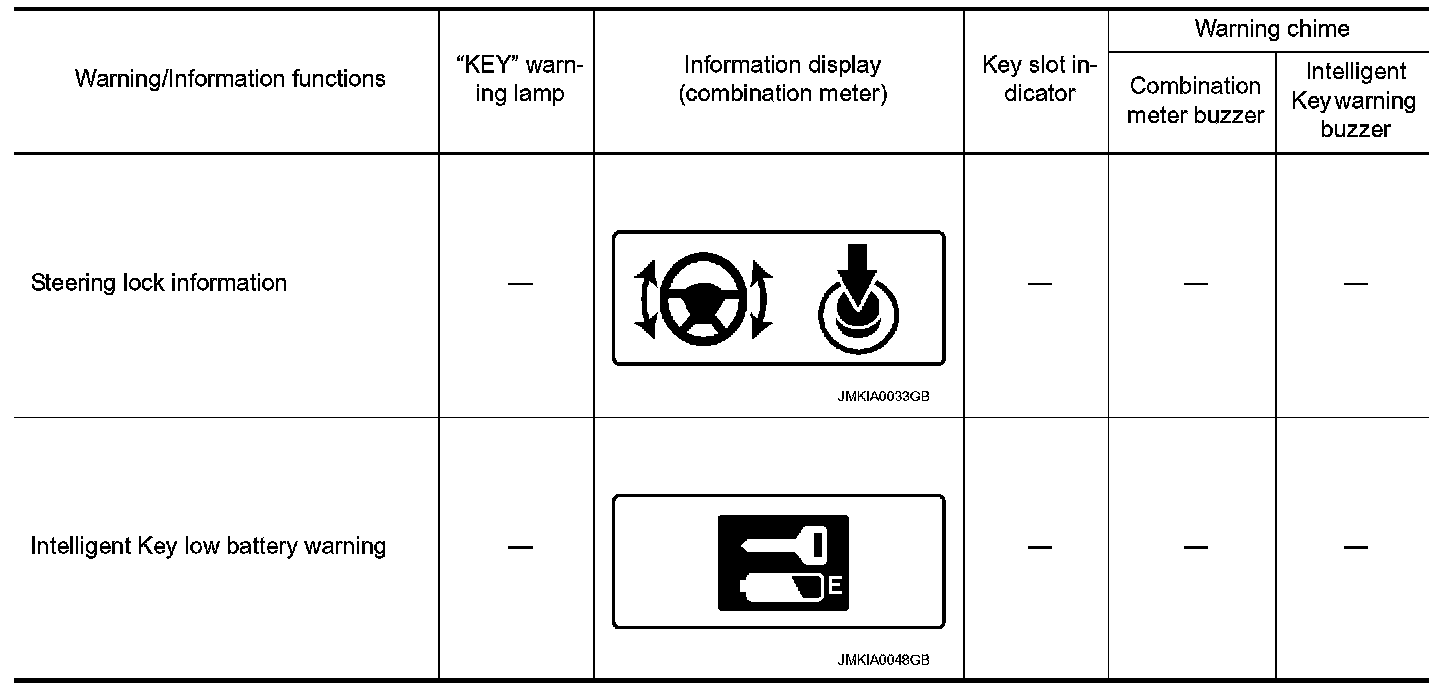The warning function are as follows and are given to the user as warning information and warnings using combinations of Intelligent Key warning buzzer, KEY warning lamp, key slot illumination and information display in combination meter.