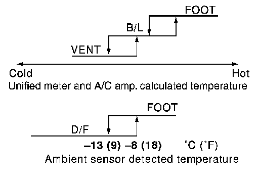 AUTO switch allows automatic control by unified meter and A/C amp. During the automatic control of mode position, a mode door position (VENT, B/L, FOOT, or D/F) is selected based on a target air mix door opening angle and sunload depending on a temperature calculated by unified meter and A/C amp. In addition, D/F is selected to prevent windshield fogging only when ambient temperature is extremely low with mode position FOOT.